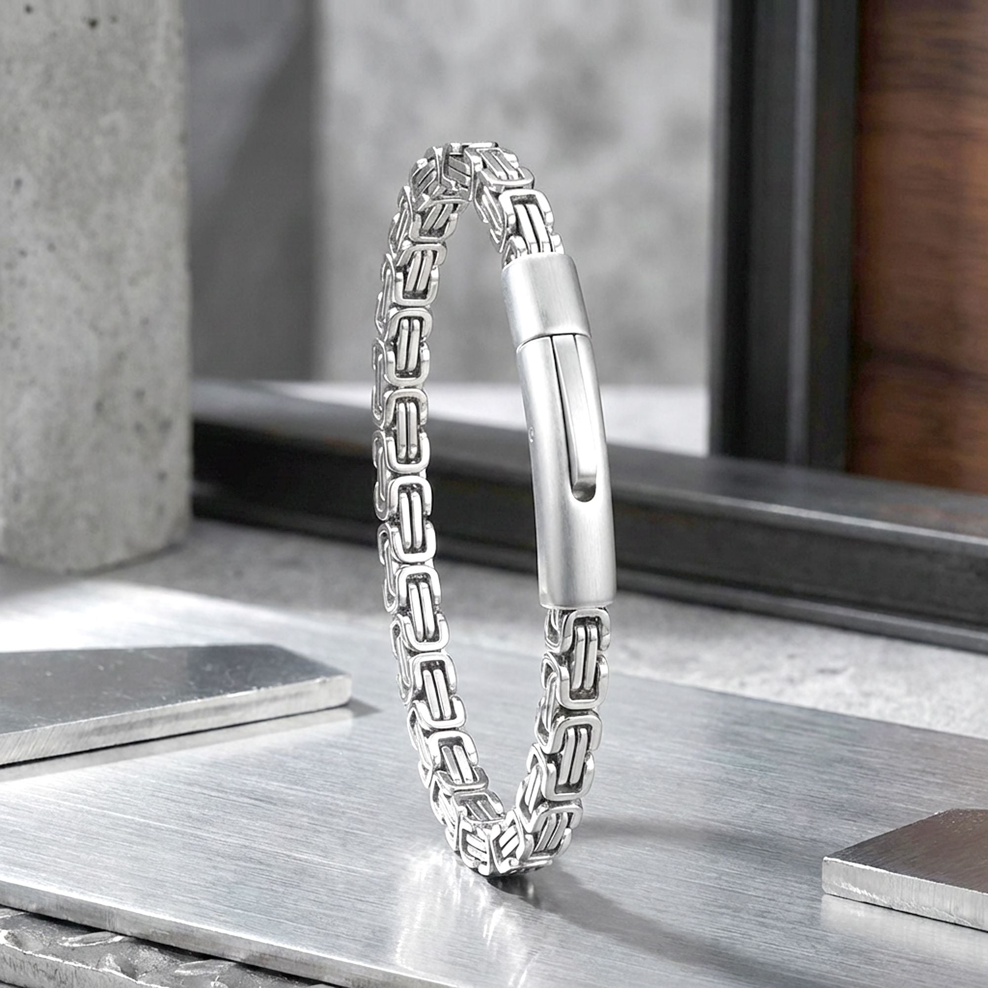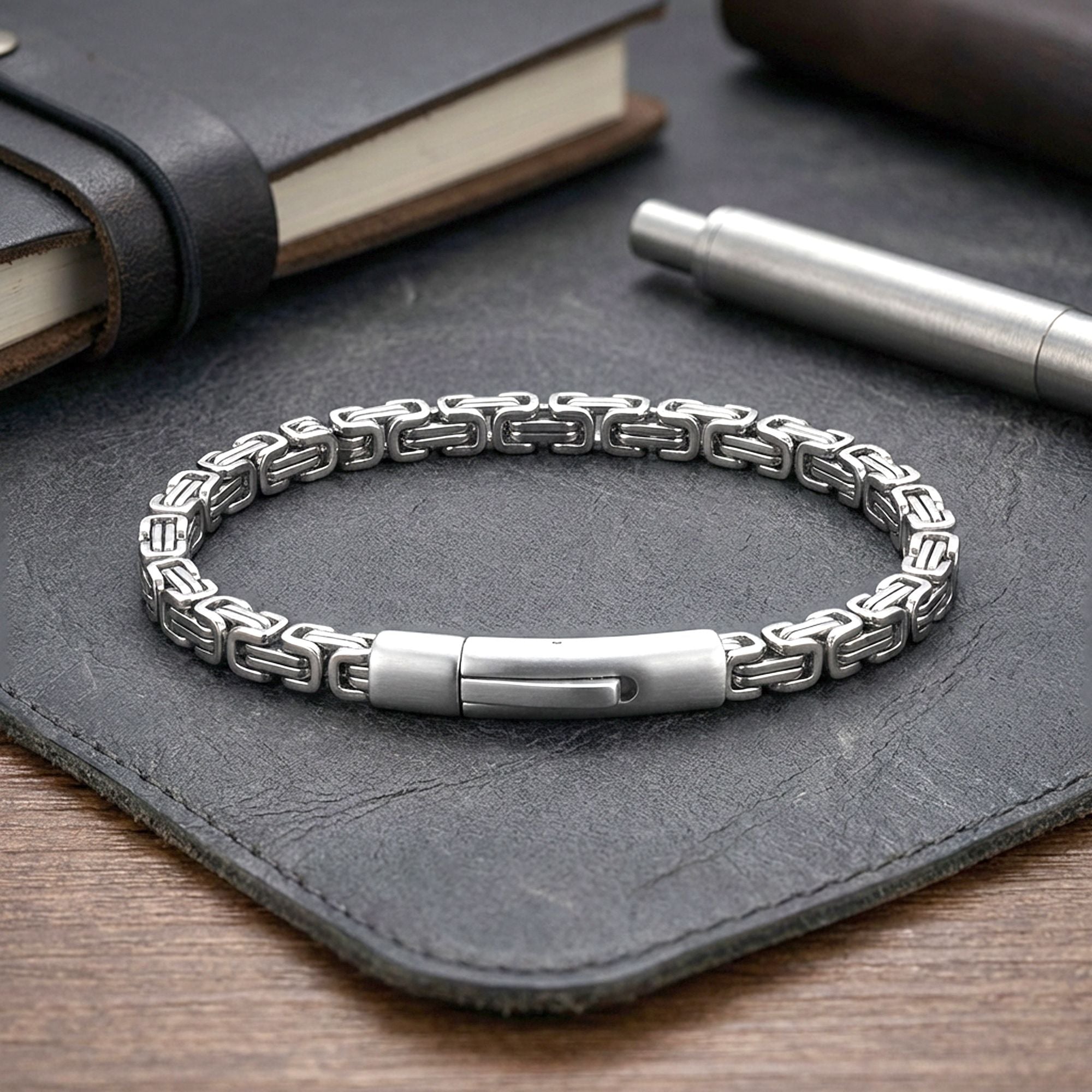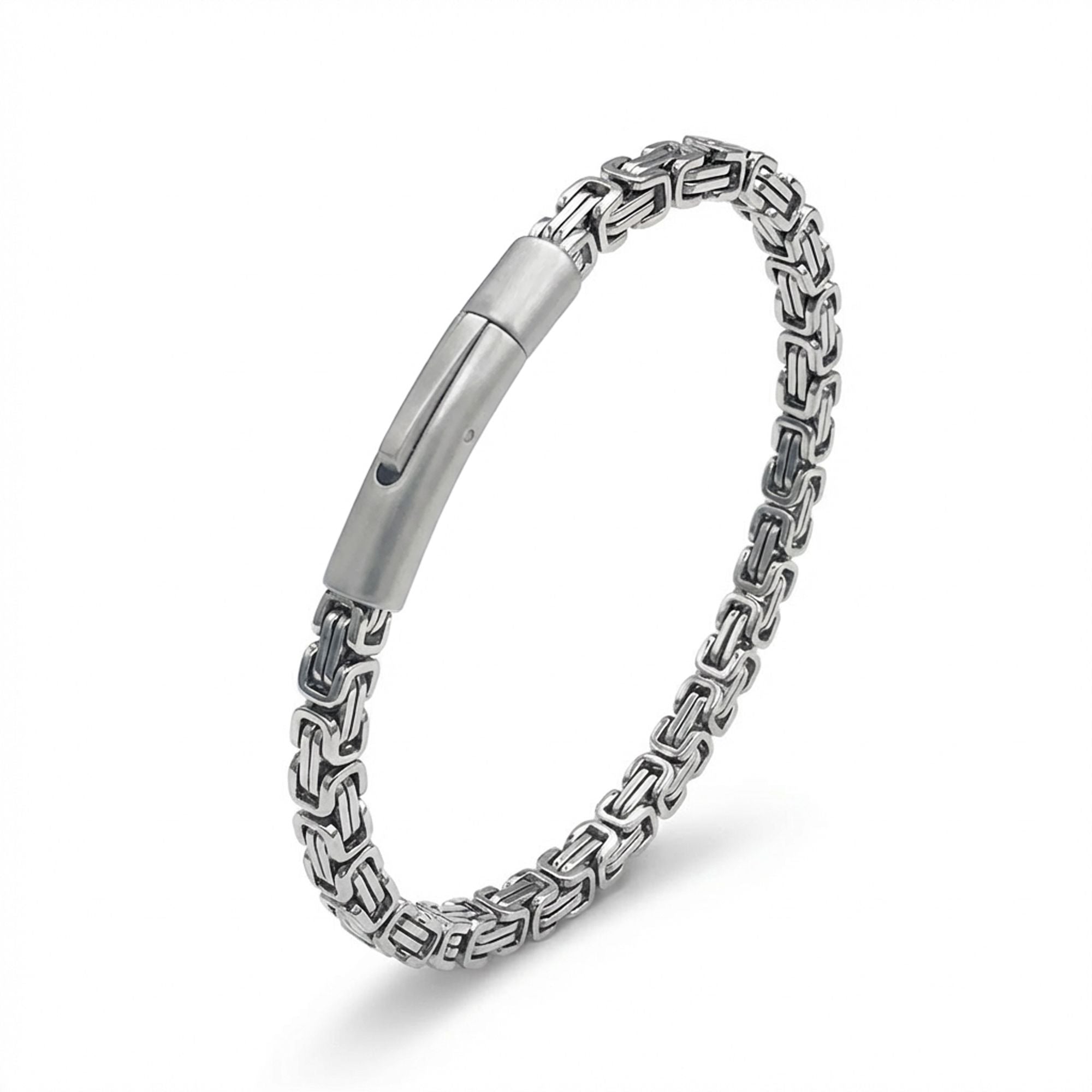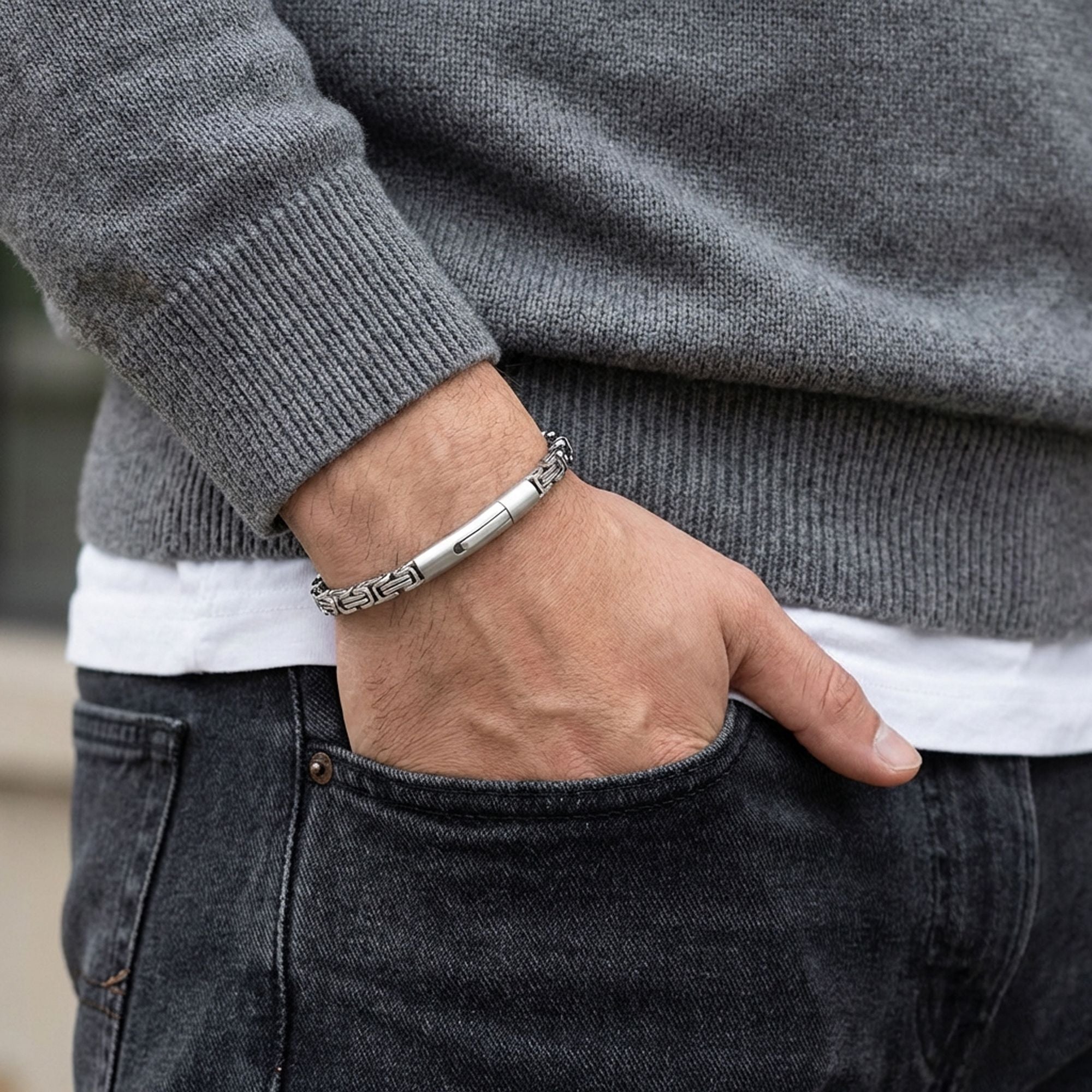 Kral model zincirin karakteristik ve birbirine geçen yapısı, bilekte güçlü ve dikkat çekici bir duruş oluşturur. Net hatlara sahip bu tasarım, sade görünümün ötesine geçerek maskülen ve kendinden emin bir stil sunar. Zincirin akıcı yapısı, bilekte dengeli ve bütünlüklü bir görünüm sağlar.